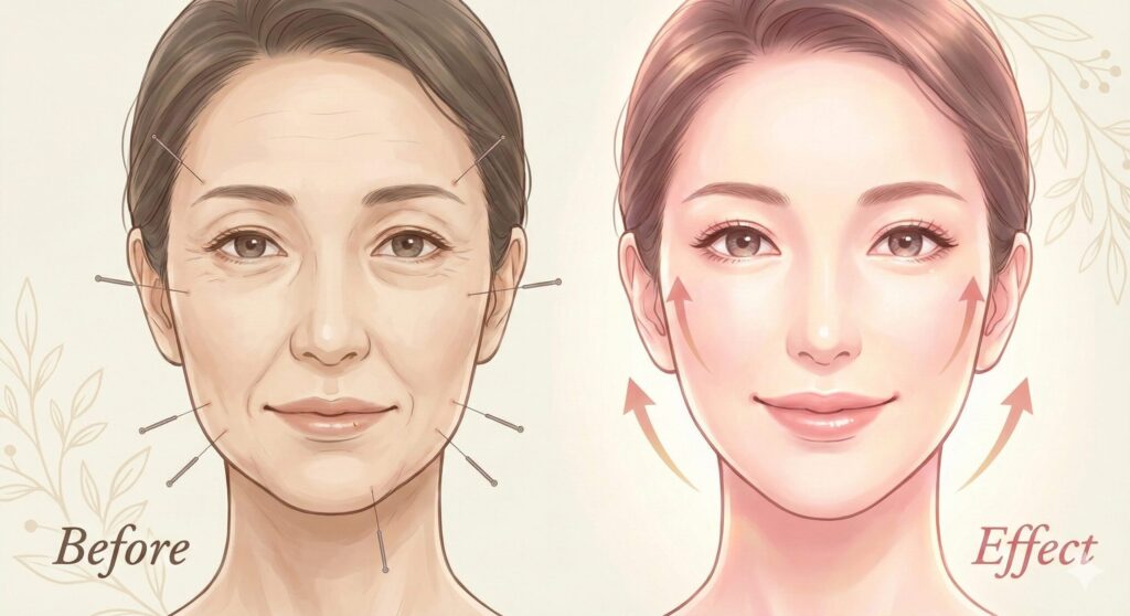 髪の毛よりも細い鍼で、肌の奥にある真皮層や筋肉を直接刺激。コラーゲンやエラスチンの生成を促し、内側からハリと弾力を取り戻します。