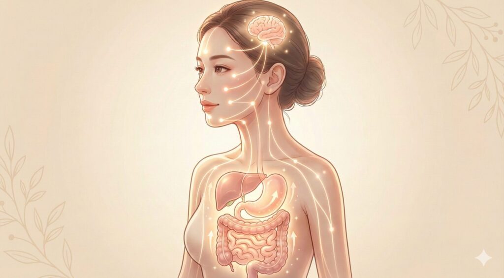 東洋医学では、お顔や頭のツボは、身体の内側の「内臓(腑臓)」とつながっていると考えられています。 お顔への鍼刺激は、これらのツボを通じて内臓の働きを活性化させ、自律神経のバランスを整える効果も期待できます。脳への血流も良くなるため、精神的な疲れやストレスの緩和にも良い影響を与えます。